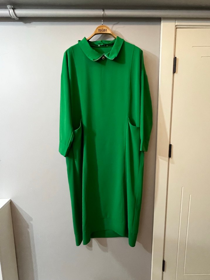 Yeşil renkte, yakalı ve uzun kollu, salaş kesim uzun elbise. Drapeli tasarıma sahip, yumuşak ve sıcak kumaştan üretilmiştir, ofis için uygundur.