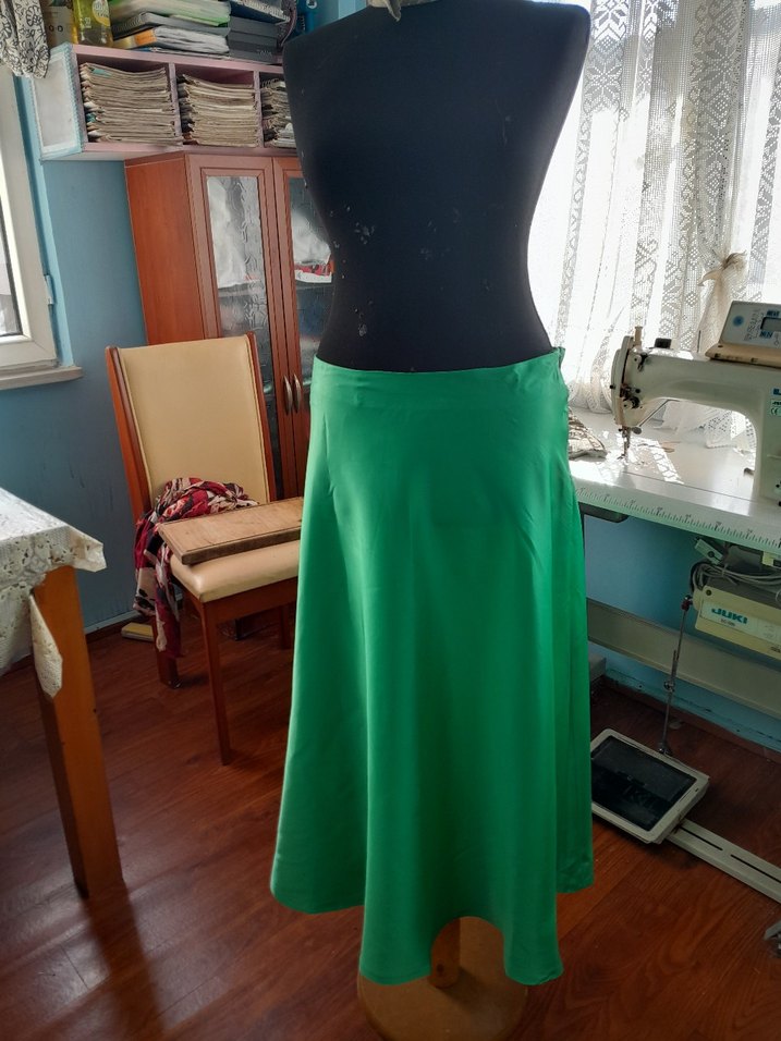 Yeşil renkte, saten dokulu, salaş kesim ve drapeli uzun etek. Parlak yüzeyiyle ofis kullanımı için uygundur.