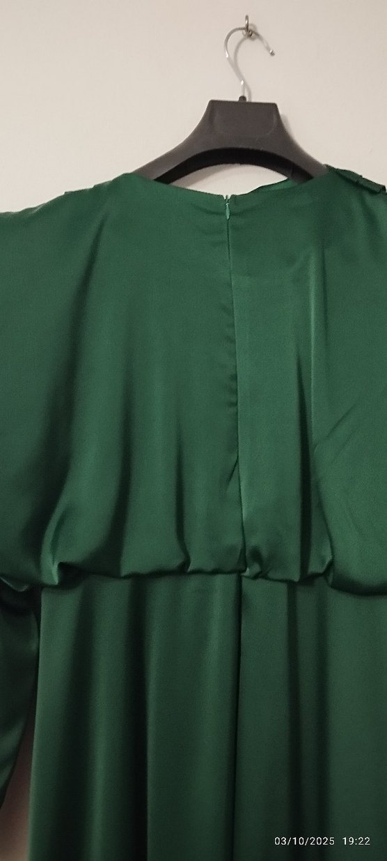 Parlak yeşil uzun saten elbise, V yaka ve askılı kollu. Rahat kesimi ve drapeli tasarımıyla çağdaş parti stiline uygundur. Boy uzunluğu 140 cm en 40 cm omuzdan omuza 50 cm 40 44 beden aralığı uygun