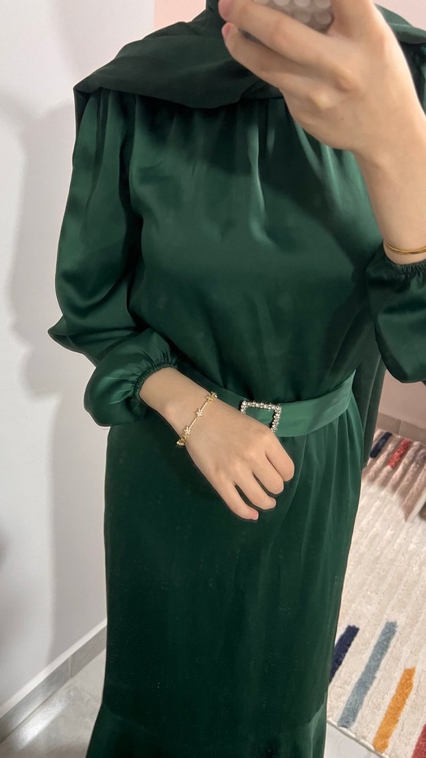 Parlak yeşil saten kumaştan, tek parça uzun elbise. Kayık yaka, ince askılı ve kemerli, minimalist ve çağdaş tasarım. Şal dahil fiyattır