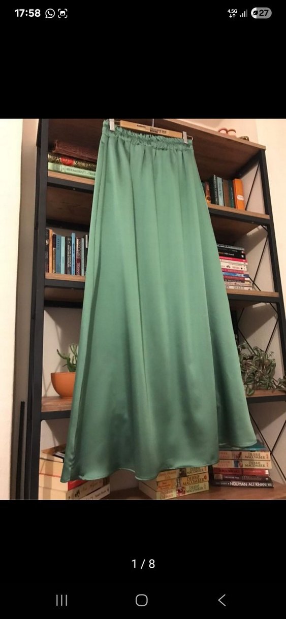 Yeşil renkli, saten kumaştan uzun ve dökümlü etek. Hiç kullanılmadı bir terzinin kendi dikimi