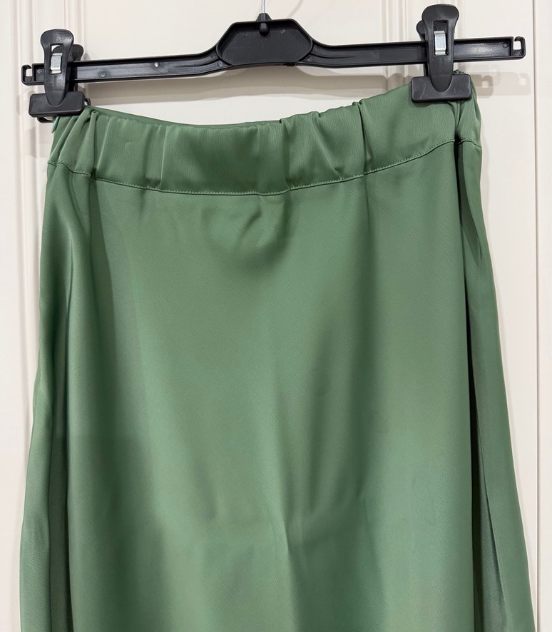 Yeşil renkli, uzun kadın eteği, bol kesim ve parlak, ipeksi kumaş ile dikkat çeker. Minimalist tasarımı günlük sokak stili için uygundur. Boyu 84 cm’dir
