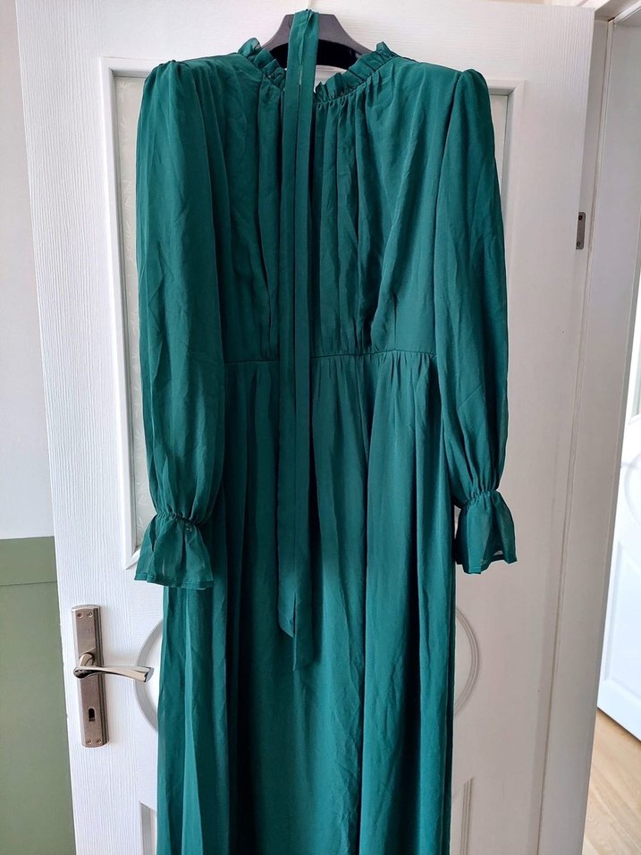 Yüksek yakalı, pileli ve uzun kollu yeşil keten elbise. Rahat kesimi ve vintage bohem tarzıyla ofis için uygun.
