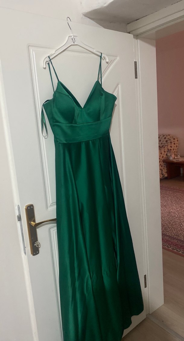 Yeşil parlak kumaştan, V yakalı ve drapeli detaylı, ince askılı uzun abiye elbisedir. Düğünler için uygundur.