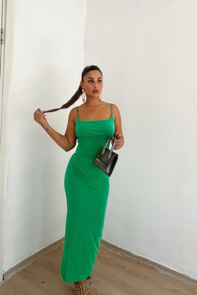 Yeşil Uzun ve İnce Askılı Elbise