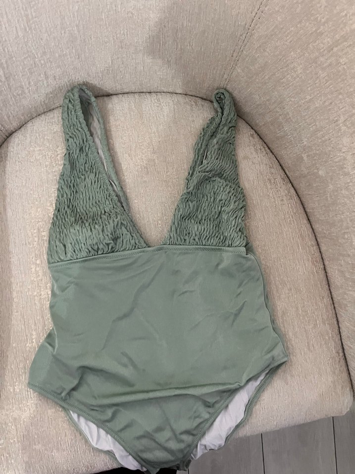 Yeşil renkli, V yaka ve doku detaylı, kolsuz, vücuda oturan basic mayo. Plaj için rahat ve şık bir seçenek. Midi boy, yumuşak kumaşlı. Kalıbı dardır 38 beden gibi