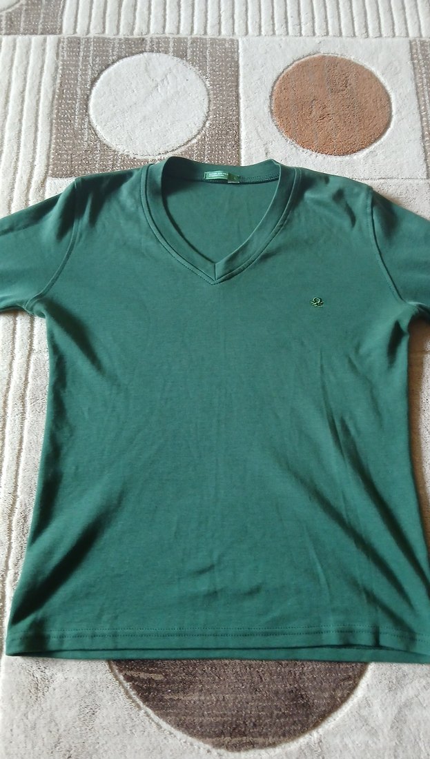 Rengi güzel bir renk sadece birkaç kere giyilmiş v yaka dar kesim güzel bir tişört kumaşı ne ince ne kalın kaliteli bir kumaş pamuklu dediğim gibi L diye görünüyor medium bedene daha güzel olur