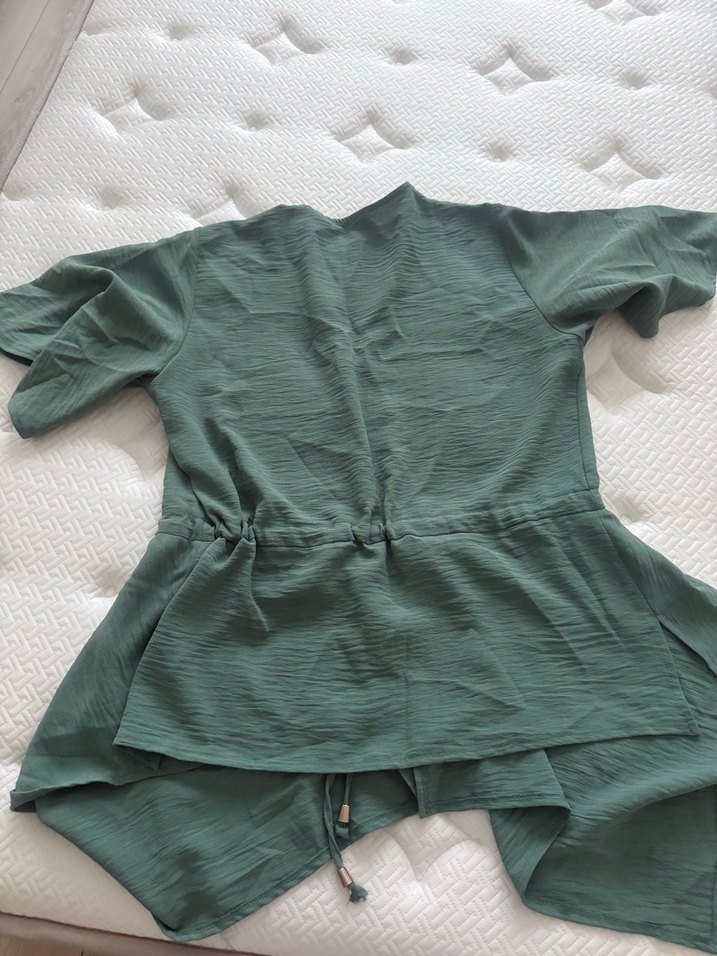 Yumuşak keten kumaştan, düğmeli ve belinde bağcıklı yeşil V yaka bohem tunik. Rahat ve şık, günlük kullanıma uygun.