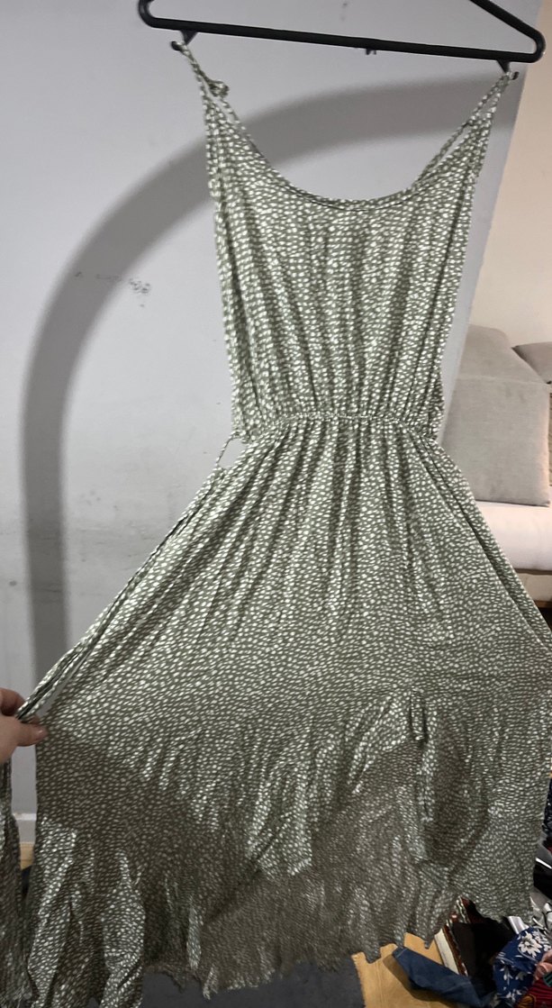 Yeşil bohem elbise, v yaka ve ince askılıdır. Yılan desenli, drapeli ve vücuda oturan tasarıma sahiptir.