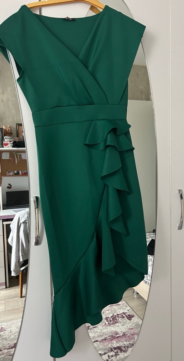 Koyu yeşil, v yaka ve kolsuz tasarıma sahip bu fitted uzun abiye elbise, ön kısmında fırfır detaylarıyla modern ve şık bir görünüm sunar.