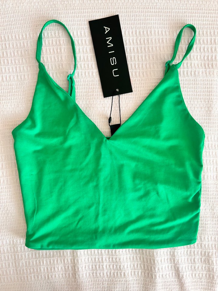 İnce askılı, V yakalı ve parlak yeşil renkte, satenimsi dokuda, kısa ve vücuda oturan crop top. Spor ve sokak tarzı için uygundur.