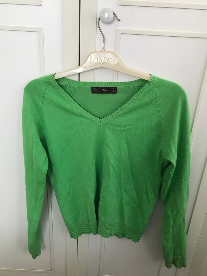Yeşil pamuk kumaştan, V yaka ve uzun kollu, bol kesimli, parlak ve minimal tasarımlı günlük kadın kazak.