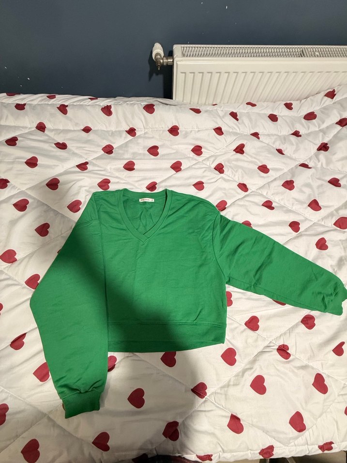 Yeşil renkli, V yakalı uzun kollu kadın sweatshirtü, pamuklu kumaştan rahat ve bol kesimdir. Günlük kullanıma uygun, renkli ve şık bir parça.