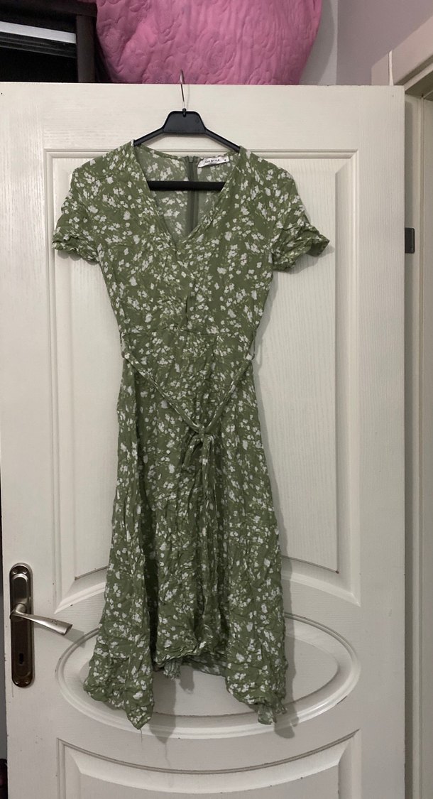 Kemerli, kısa kollu ve V yakalı uzun, bol kesim kadın elbisesi. Yeşil baskılı desene sahip, sentetik kumaştan yapılmıştır. Günlük kullanım için uygundur. Eni 40 cm boyu 100cm