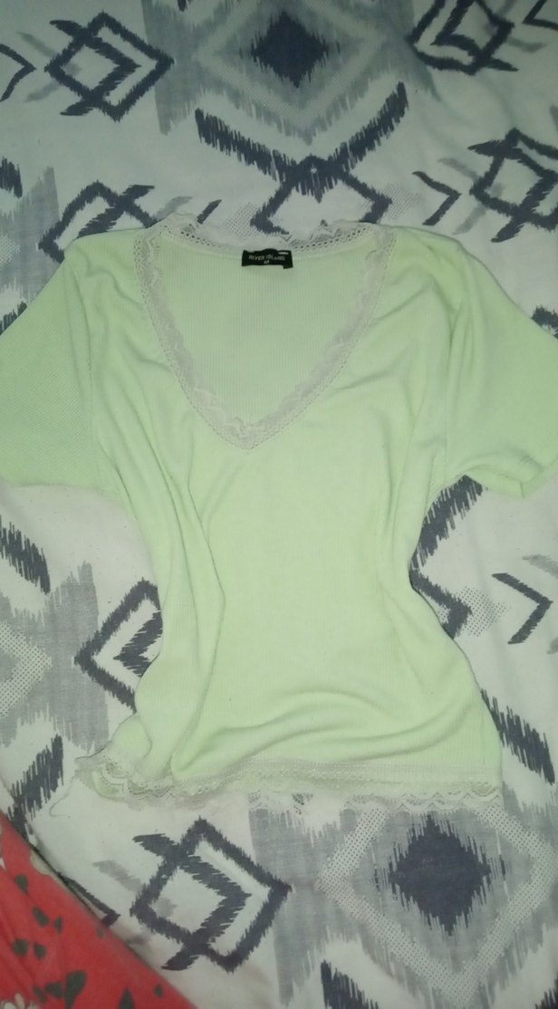 Pastel yeşil renkte, V yakalı, dantel detaylı, kısa kollu ve pamuklu kumaştan rahat kesimli kadın bluz. Midi boyda, günlük ve sokak stiline uygun.
