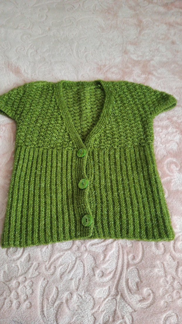 Parlak yeşil renkte, V yaka ve kısa kollu, örme triko hırka. Bol kesim ve kısa boy ile günlük kullanıma uygun. ben kendim ördüm el örgüsü dur