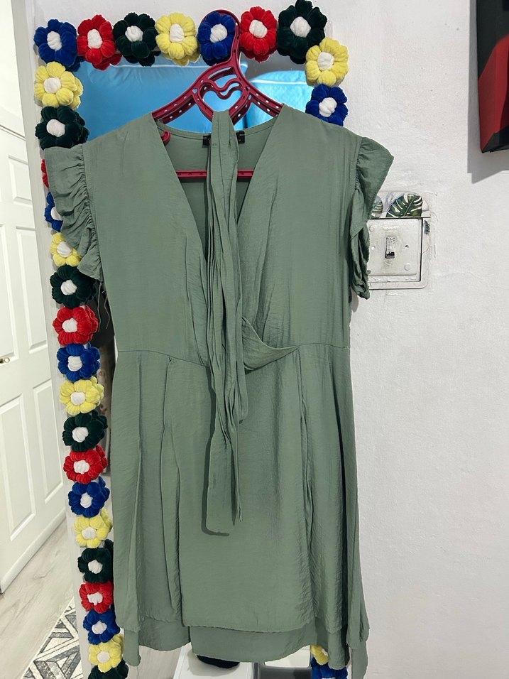 Yeşil renkte, V yakalı, kolsuz ve volan detaylı midi boy bol kesim elbise, yumuşak sentetik kumaştan üretilmiştir.S-M bedene uygundur