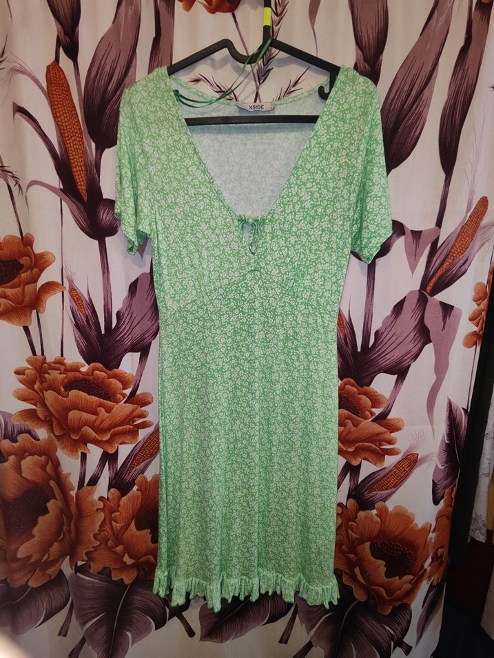 V yakalı, kısa kollu, yeşil pastel tonlarda bağlama desenli, dantelli, midi boy, vücuda oturan sentetik kumaş elbisedir.