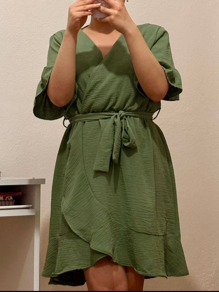 Yeşil renkli, V yakalı, bol kesim midi elbise. Keten kumaştan, drapeli ve bağcıklı bel detaylı, rahat ve şık bir görünüm sunar. Günlük kullanım için uygundur.