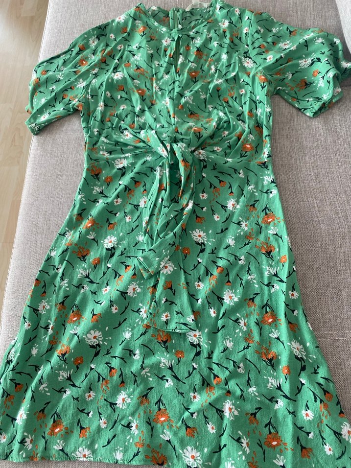 Yeşil v yaka midi elbise, kısa kollu ve vücuda oturan kesime sahiptir. Yumuşak sentetik kumaştan, bohem tarzda ve pastel çiçek desenlidir.
