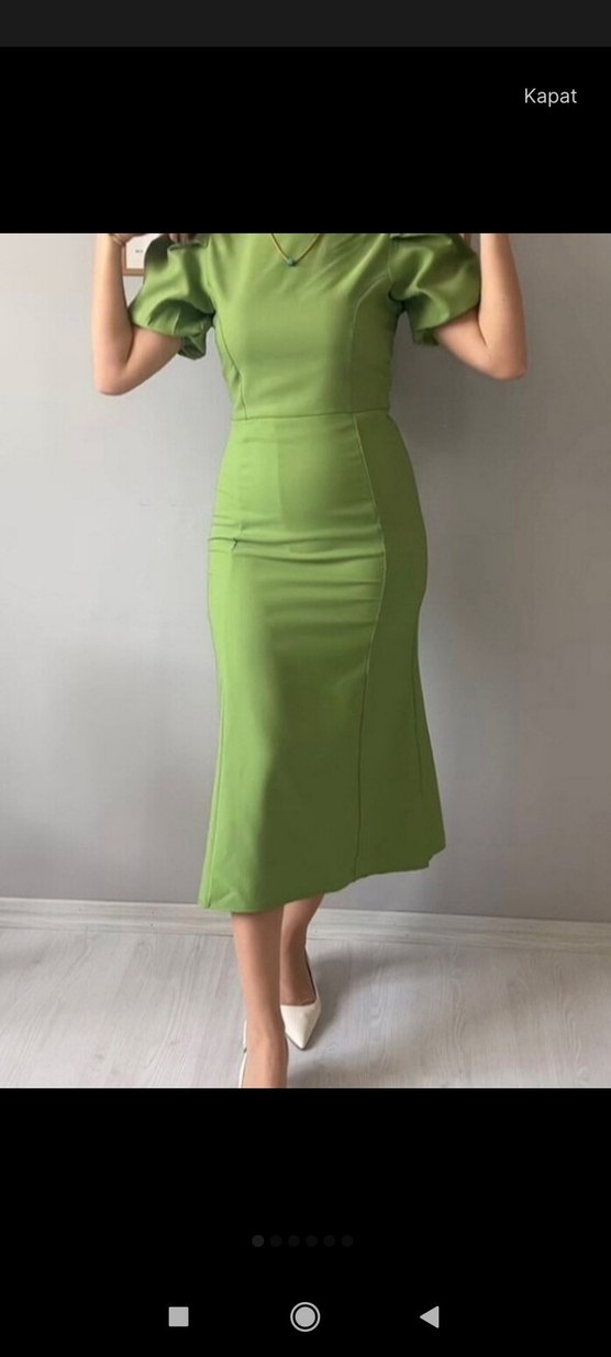 Pastel yeşil uzun elbise, V yaka ve kısa kollu, rahat kesimiyle zahmetsiz şıklık sağlar. Ofis için minimalist, çağdaş tarzda.