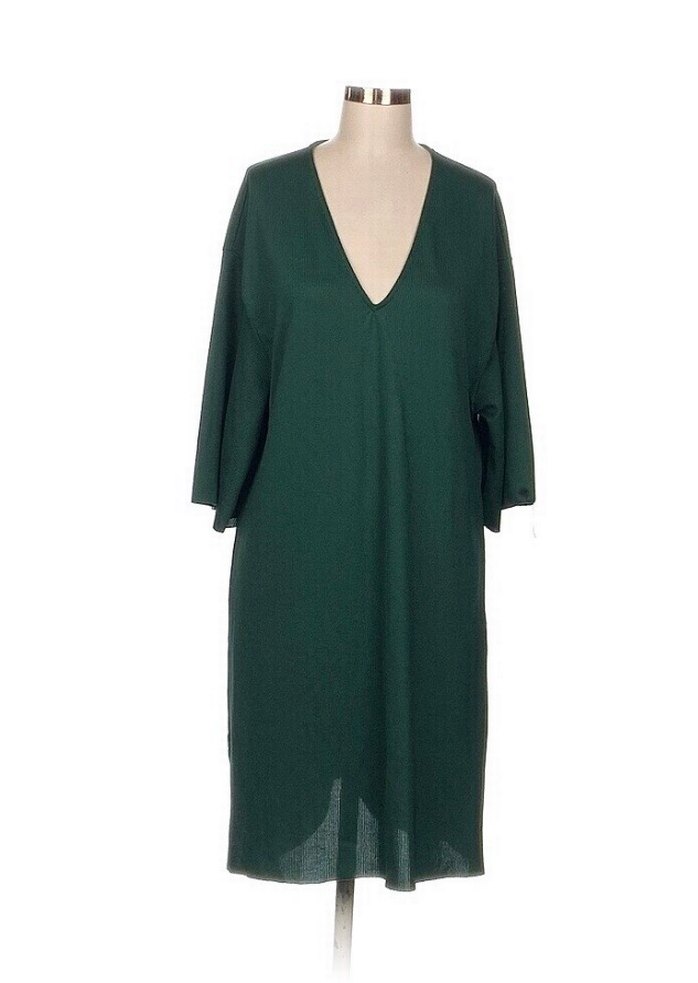 Koyu yeşil midi uzunlukta, kısa kollu, V yakalı ve bol kesimli kadın elbisesi. Pürüzsüz sentetik kumaştan, ofis için minimalist ve şık bir tasarım. Göğüs 54 uzunluk 100 cm. Yarım kol.