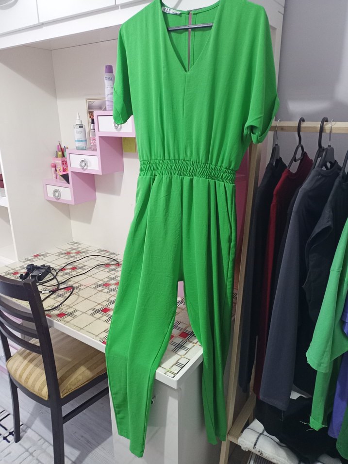 Yeşil renkte, V yakalı ve kısa kollu midi tulum. Rahat kesimli, elastik bel detaylı, günlük kullanıma uygun şık tasarım.