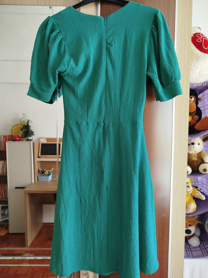 Yeşil midi elbise, kare yaka ve kısa kollu, bol kesim ve pile detaylı, vintage esintili bohem tarzda, ofis için uygun.