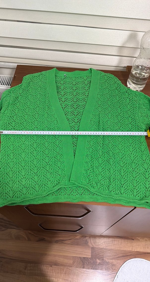 Açık yeşil renkli, V yakalı ve uzun kollu örgü hırka. Salaş kesimi ve midi boyu ile bohem tarzına uygun, günlük kullanım için rahat ve sade. Hiç kullanmadım denediğimde etiketi ensemi rahatsız ettiği için kopartmıştım ama dıkunmasaymışım keşke hiç kullanmadım dolapta öyle kaldı