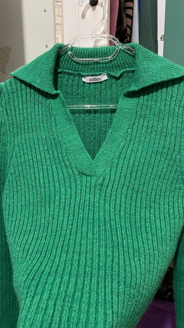 V yaka ve uzun kollu, yeşil örgü kumaştan yapılmış, parlak görünümlü, günlük sokak stili için uygun, rahat ve şık kadın kazak.