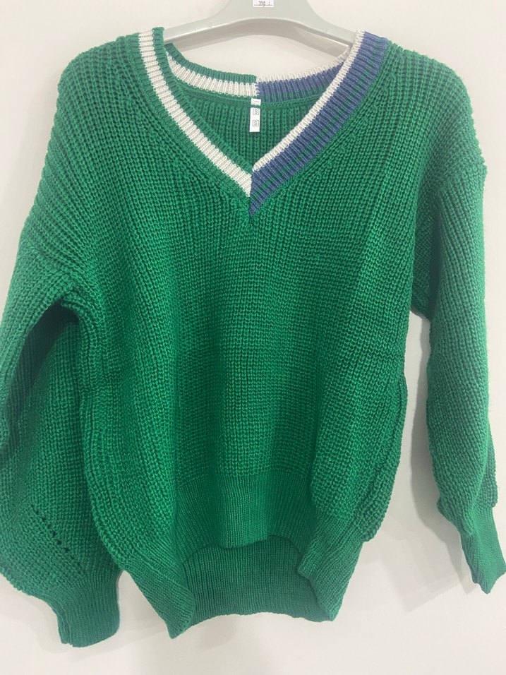 Yeşil renkli örgü kadın kazak, renkli V yaka ve uzun kolludur. Rahat, bol kesimiyle gündelik sokak stiline uygundur.