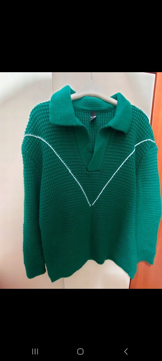 Yeşil renkte, V yaka ve uzun kollu, gevşek ve kısa kesim örgü kadın kazak. Rahat ve renkli sokak giyimi tarzında. hiç kullanılmadı defosu yok 38 bedene olur