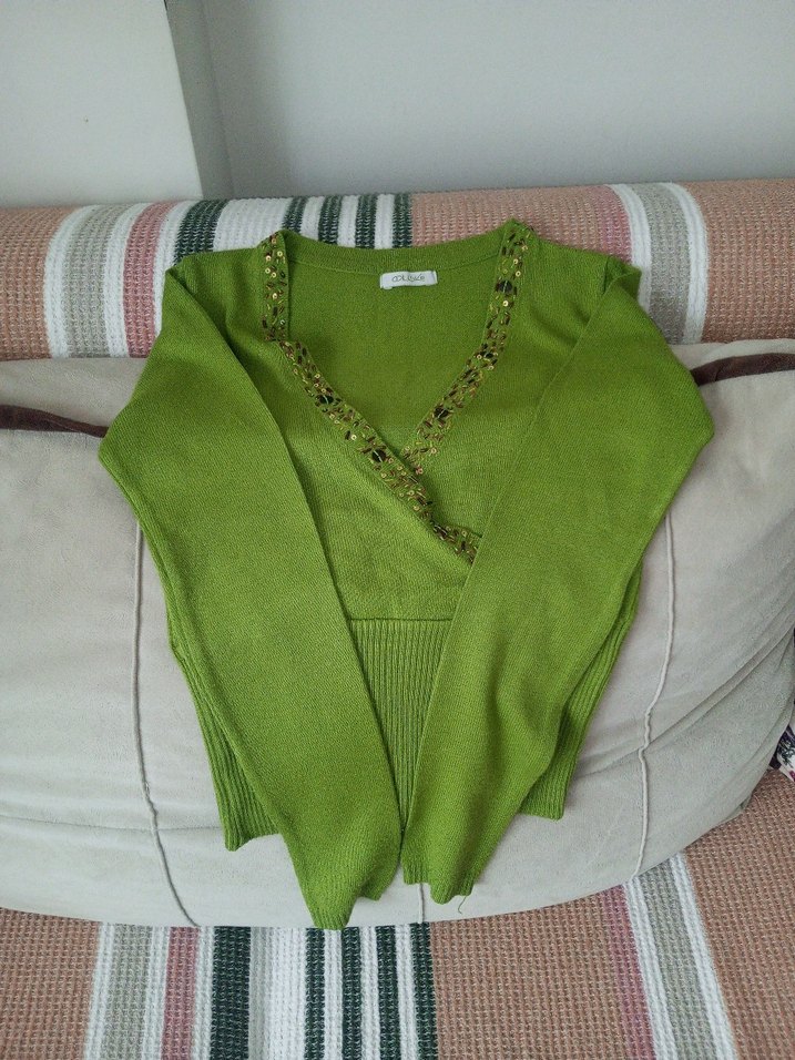 Fitted kesim yeşil örgü kazak, V yaka ve uzun kollu. Normal midi boyuyla günlük kullanıma uygun şık parça.