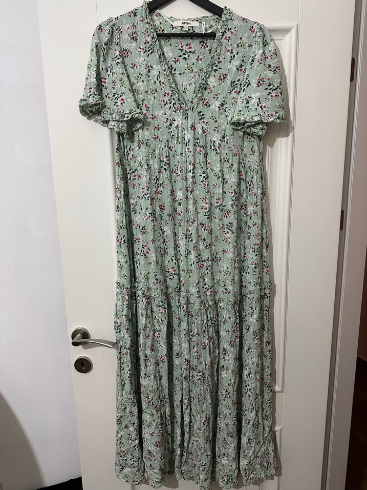 Yeşil pamuklu kumaştan, V yakalı, kısa kollu, bol kesim ve pile detaylı uzun bohem elbisedir. Pastel çiçek desenlidir, günlük kullanım için uygundur.