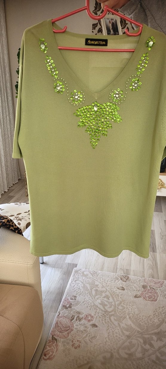 Yeşil renkte, V yaka ve kısa kollu tunik. Yumuşak triko kumaştan, bol kesim ve uzun boy. Parlak payet işlemeleriyle bohem tarzda, günlük kullanıma uygun.