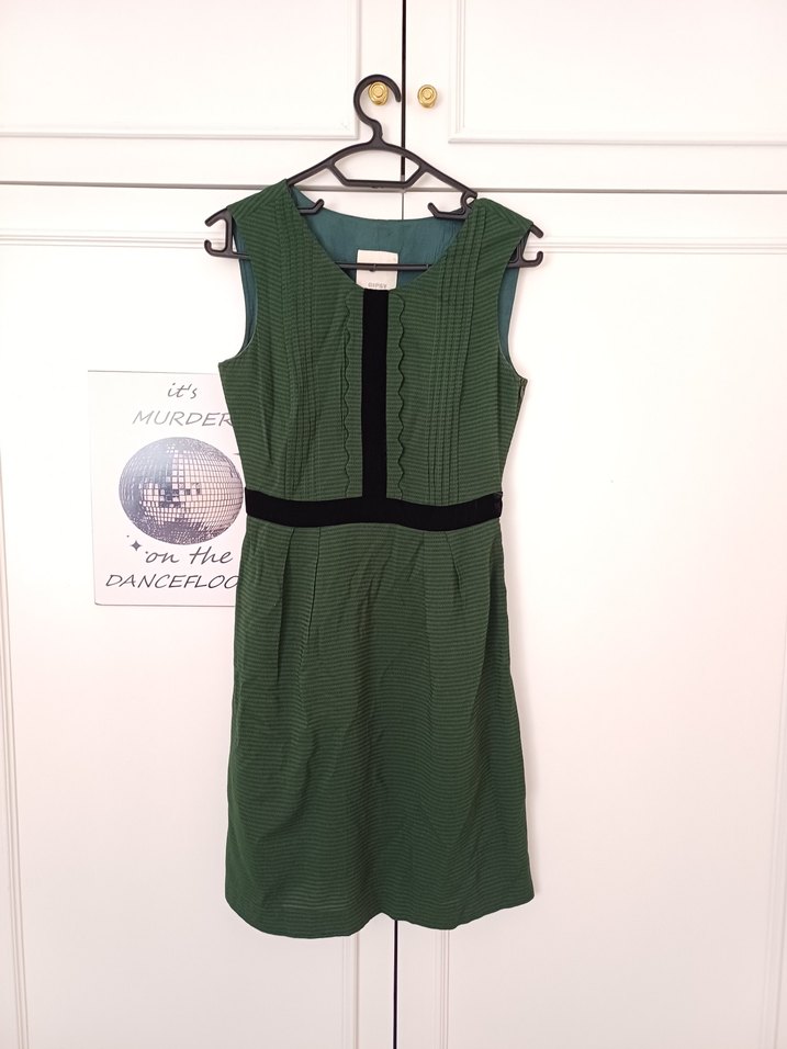 Yeşil, v yaka, kolsuz elbisesi, piliseli detaylı ve dar kesim. Yumuşak sentetik kumaştan, baskılı desenli, ofis için uygun. Üzerinde 'DANCEFLO, it's, MURDER' yazısı bulunur.