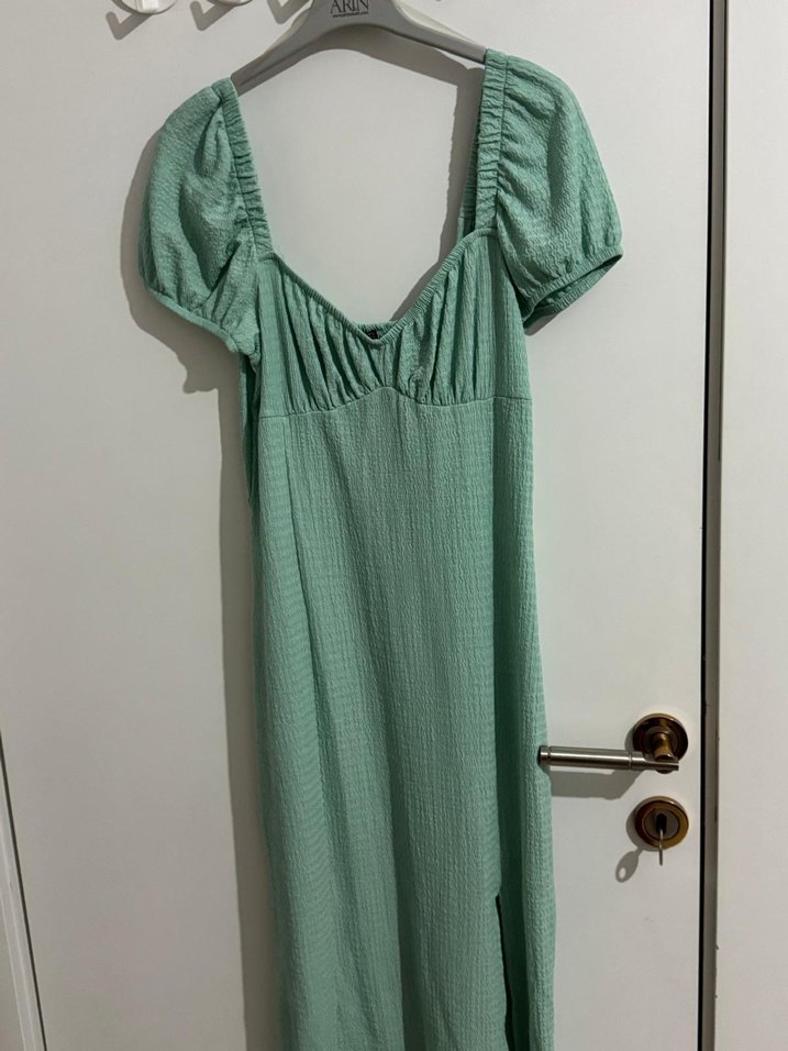 Uzun, v yaka ve kısa kabarık kollu, yeşil renkte keten kumaştan piliseli elbise. Minimalist tarzda, günlük kullanıma uygun.