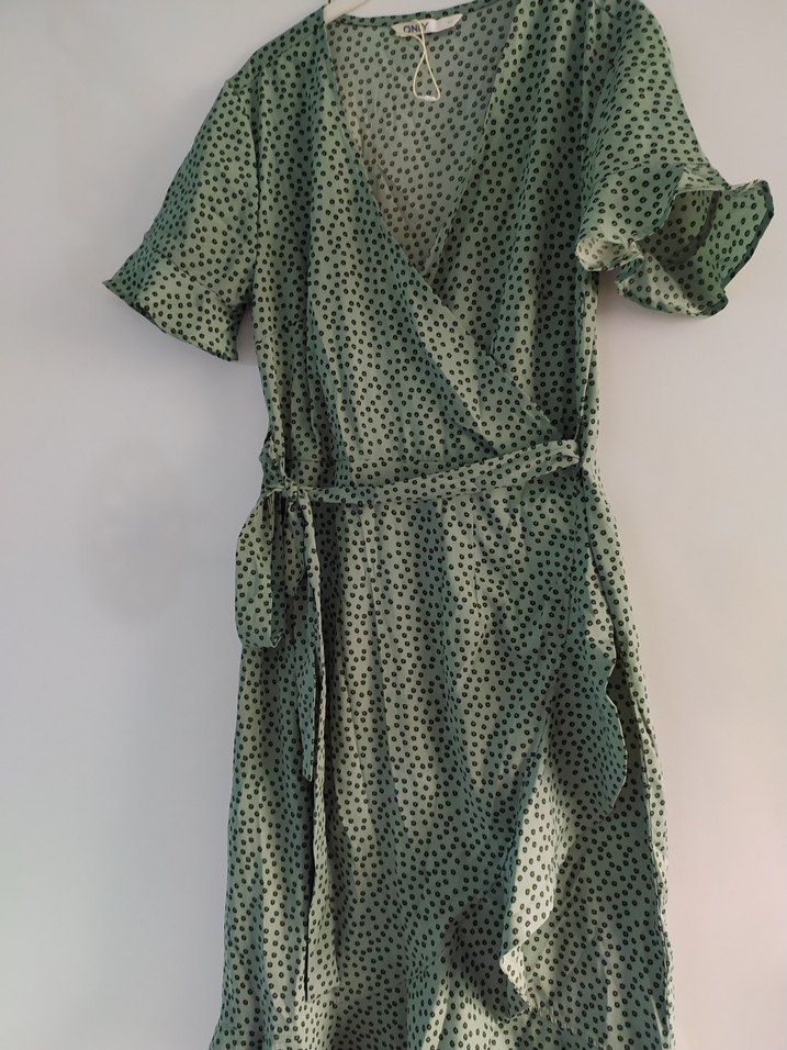 Yeşil midi elbise, salaş kesim ve drapeli tasarıma sahiptir. Yumuşak sentetik kumaştan üretilmiş, V yakalı ve kısa kolludur, günlük sokak stili için uygundur.