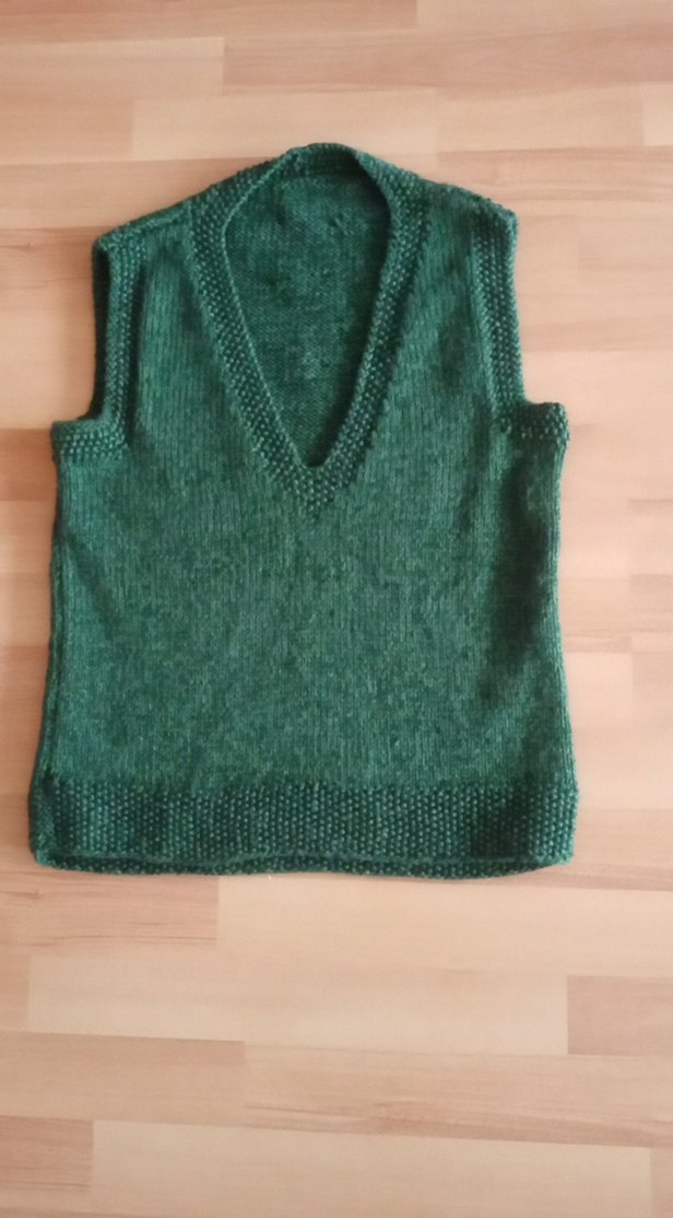 Yeşil renkli, V yakalı, örme kumaştan yapılmış, kolsuz ve bol kesim el örgüsü süveter. Günlük kullanıma uygun, rahat ve parlak görünümlü boy 57cm iki koltuk arası 46cm.