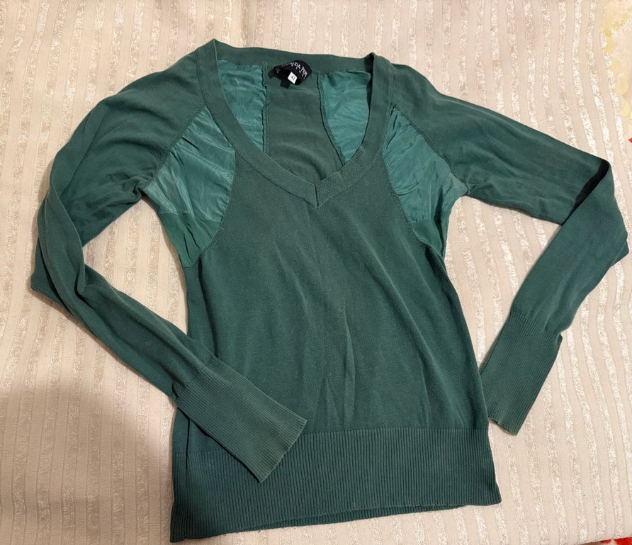 V yaka ve uzun kollu, koyu yeşil renkli, triko dokulu sentetik kumaştan yapılmış, dar kesim kadın kazak. Sorunsuzdur S-M uyumlu orjinal markadır