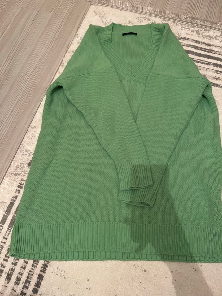 Yeşil renkli, V yakalı uzun kollu triko kadın kazak, rahat ve salaş kesimlidir. Normal boyda ve pastel tonuyla günlük kullanıma uygundur.