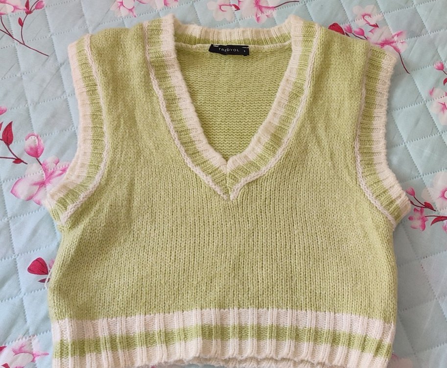 V yaka, triko, yeşil renkli, kolsuz, fitted kesim süveter. Rahat ve şık, günlük kullanıma uygun.
