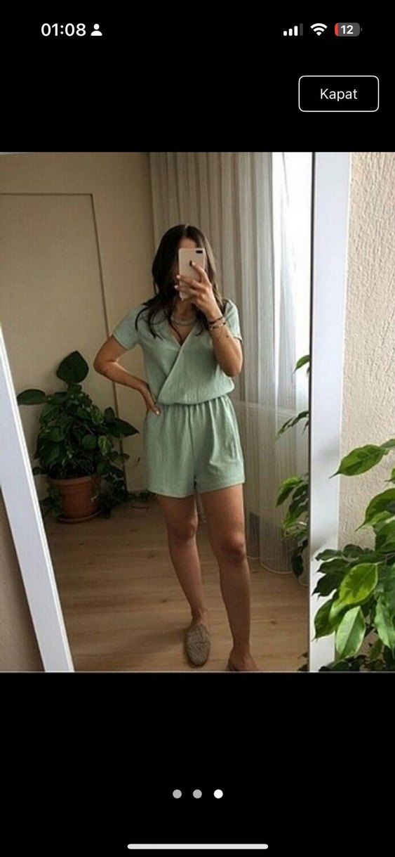 Yeşil tulum, V yaka ve kısa kollu olup, bol kesimiyle rahat ve şık bir görünüm sunar. Günlük kullanıma uygundur. Tertemiz
