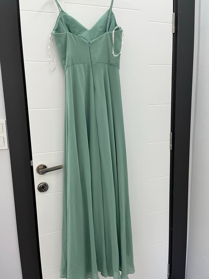 Yeşil tonlarında, V yaka ve ince askılı, drapeli uzun ve dar kesim abiye elbise. Düğünler için uygun, modern klasik tarzda.