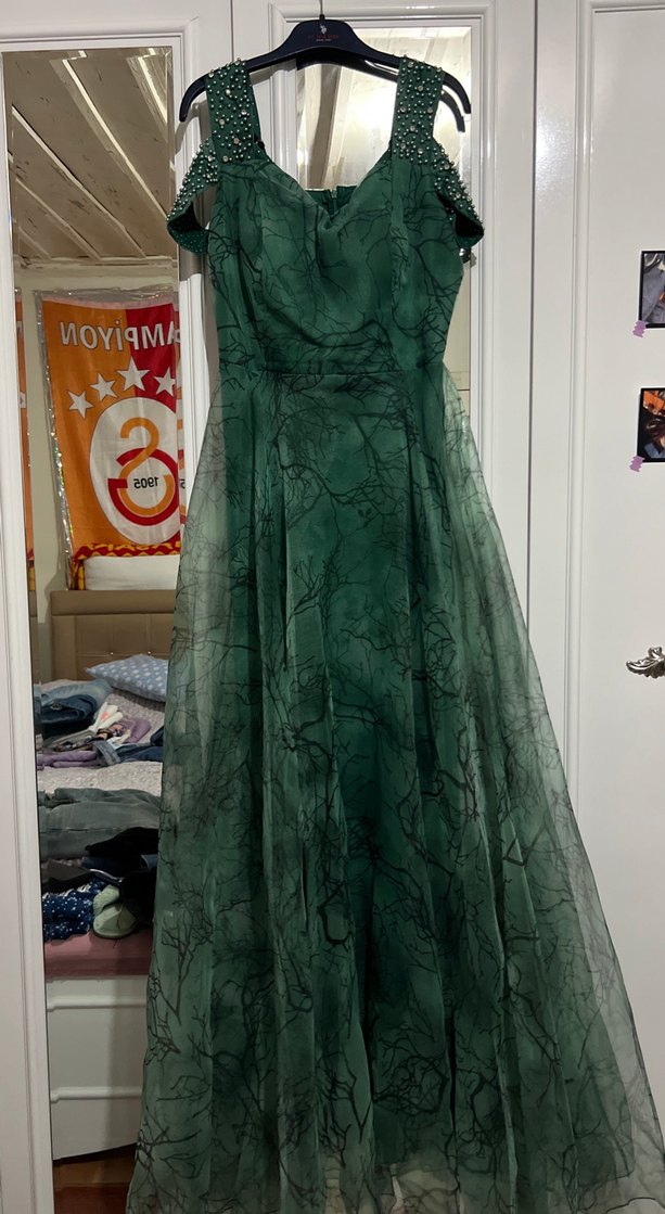 Yeşil V Yaka Uzun Drapeli Abiye Elbise