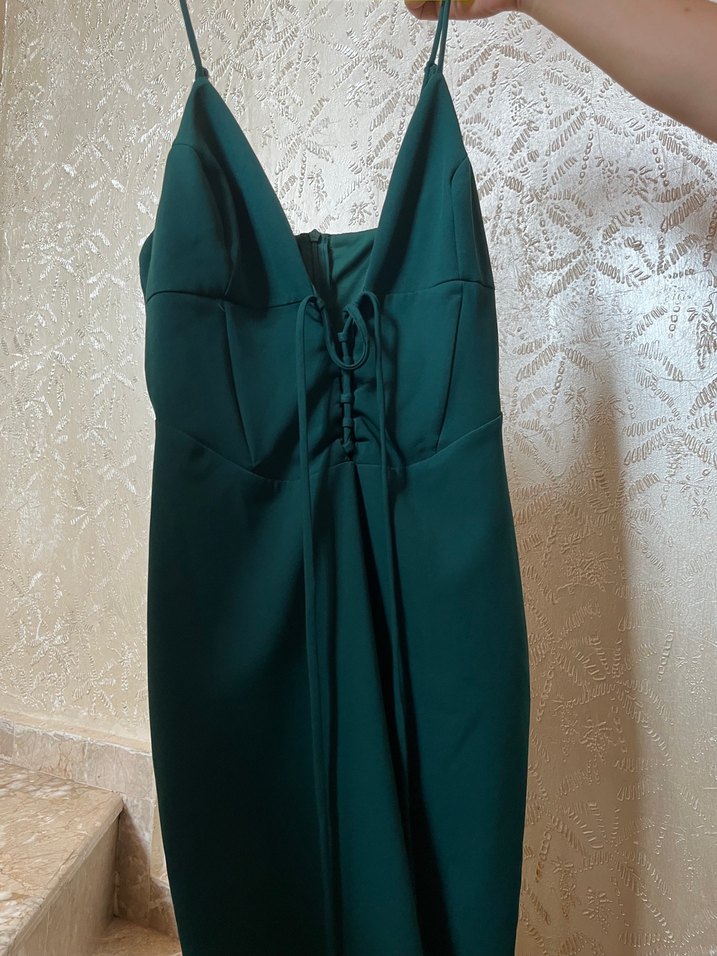 Koyu yeşil uzun elbise, V yaka ve ince askılarla. Drapeli ve vücuda oturan kesimiyle bohem tarzda, cesur parti kombinleri için uygun.
