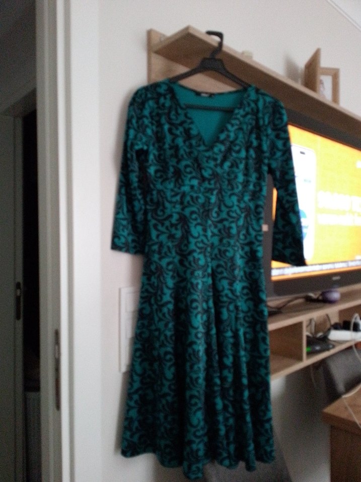 Koyu yeşil renkte, V yaka ve uzun kollu hamile elbisesi. Baskılı, vintage desenli, bol kesim ve drapeli midi boyda, ofis için uygun bohem tarzda.