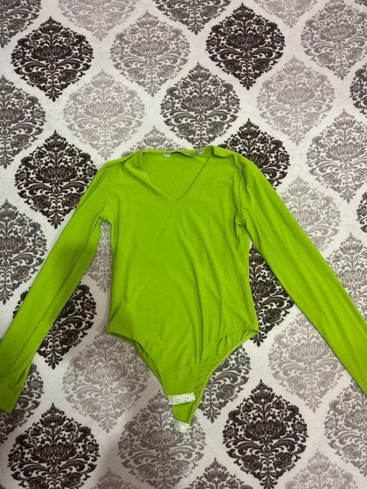 Yeşil renkli, V yakalı ve uzun kollu, vücuda oturan kadın bluz. Yumuşak sentetik kumaştan üretilmiş, normal midi uzunluğunda ve sade tasarımlı. Günlük kullanıma uygun.