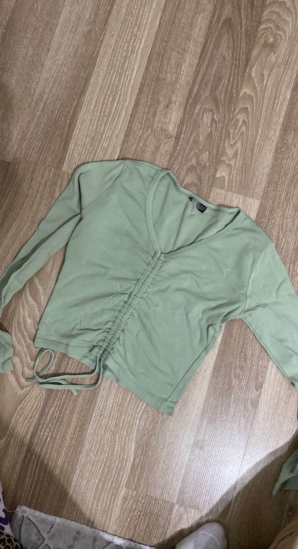 Yumuşak keten kumaştan, uzun kollu ve V yakalı, düğmeli, ön kısmı büzgülü, pastel yeşil renkli, dar kesim kız bluzu.