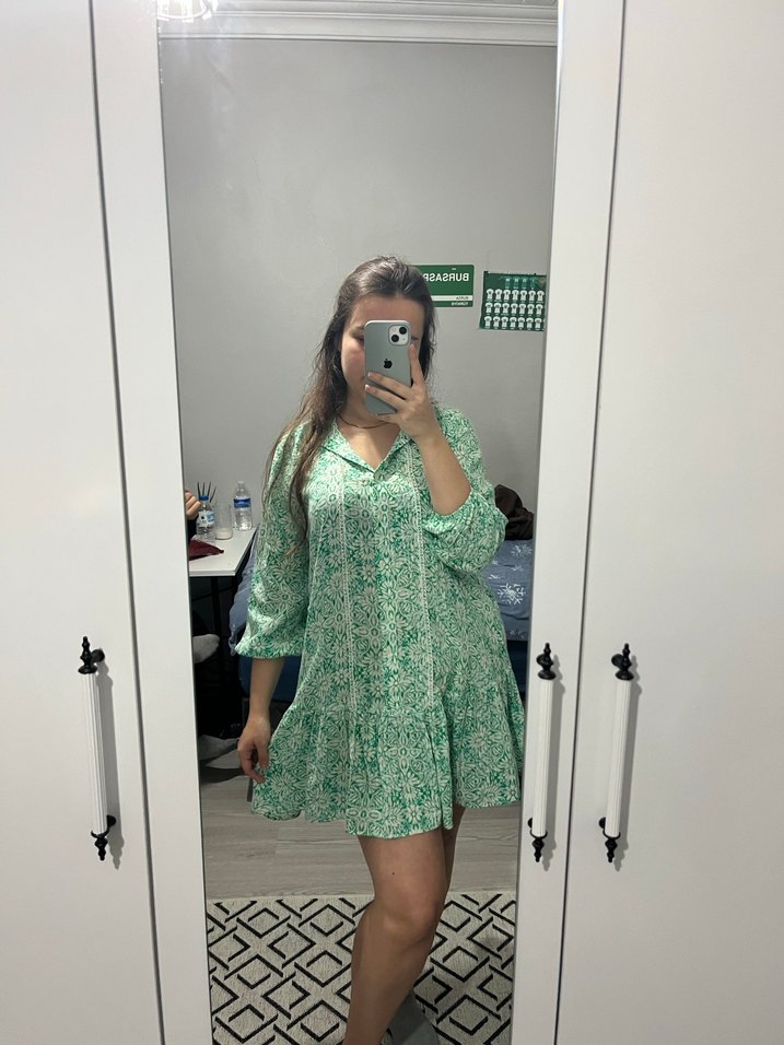 Bu bol kesim midi elbise, V yaka ve uzun kollara sahiptir. Hafif sentetik kumaştan yapılmış, yeşil batik desenli ve dantel detaylıdır. Günlük kullanıma uygundur.